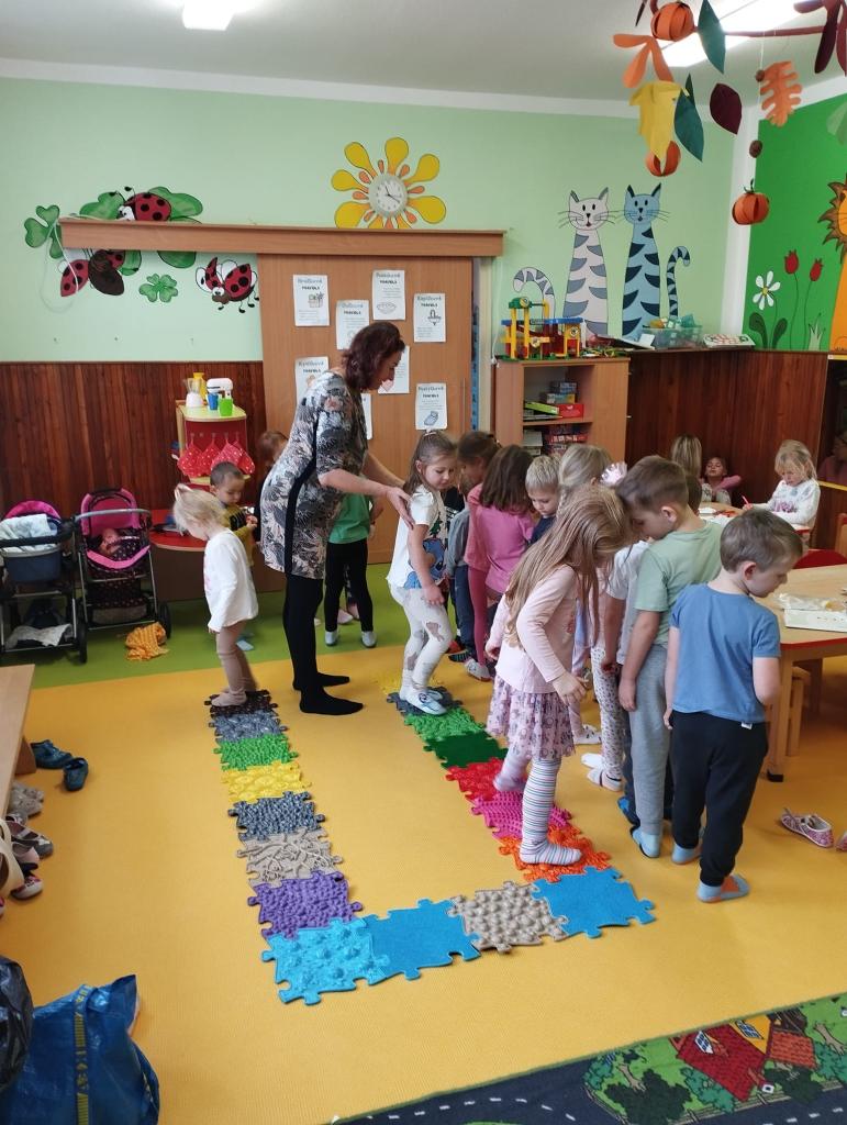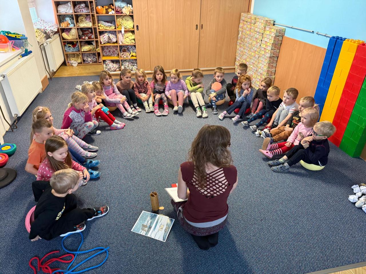 V rámci spolupráce s rodiči nás navštívila paní Dvořáková, která si pro děti připravila program na téma „Medvídku, kam pluješ?“. Děti si s chutí poslechly pohádku, aktivně se zapojovaly do činností v rámci příběhu, koulovaly se papírovými kuličkami a houpaly se na míči jako medvídek na ledě v moři.
