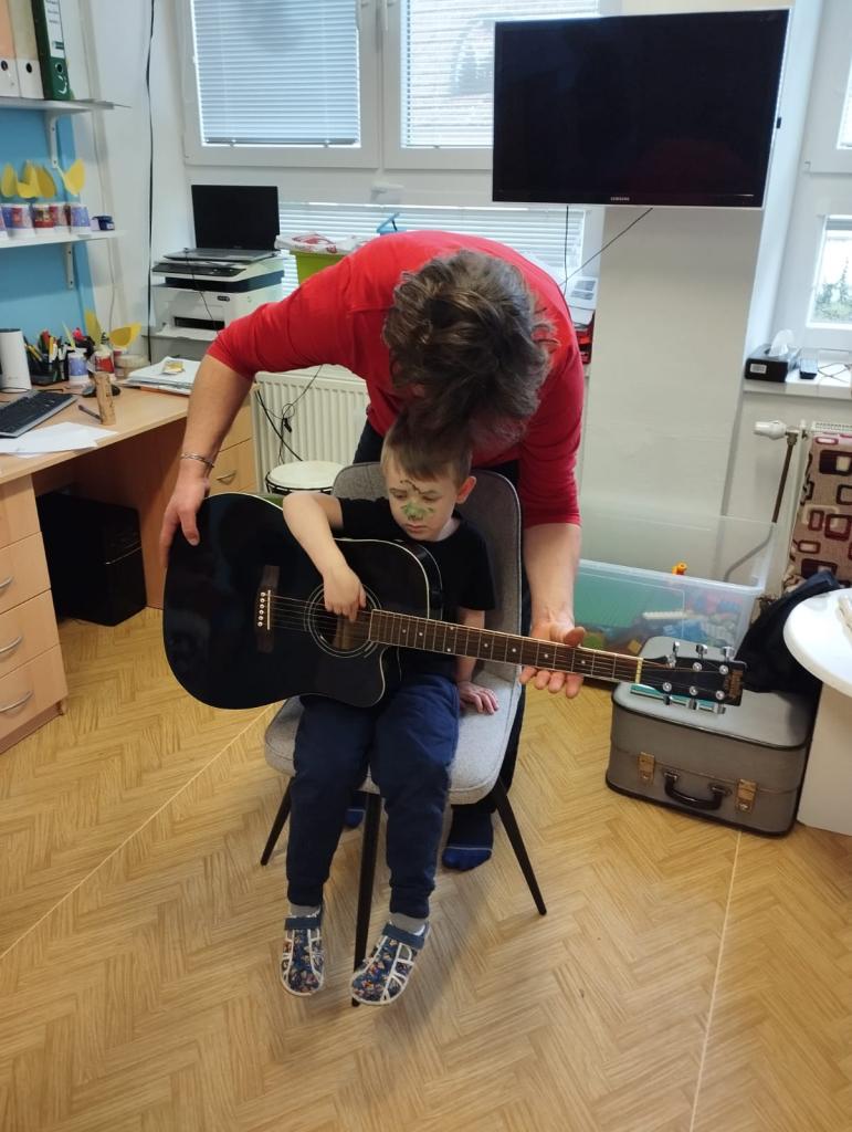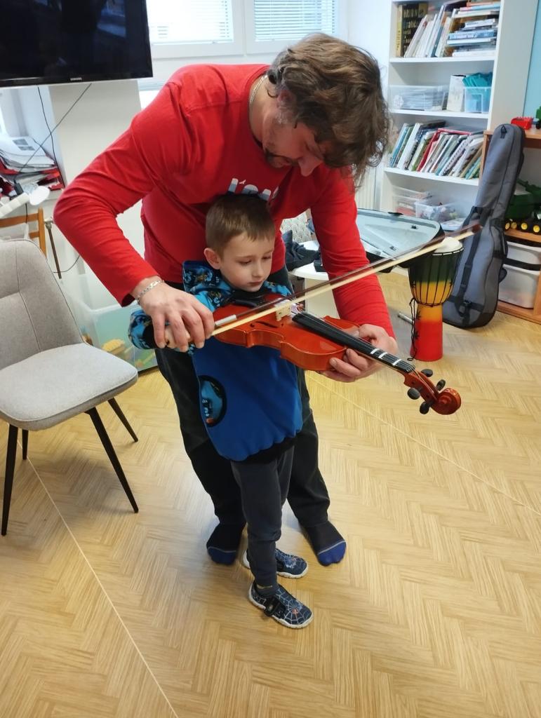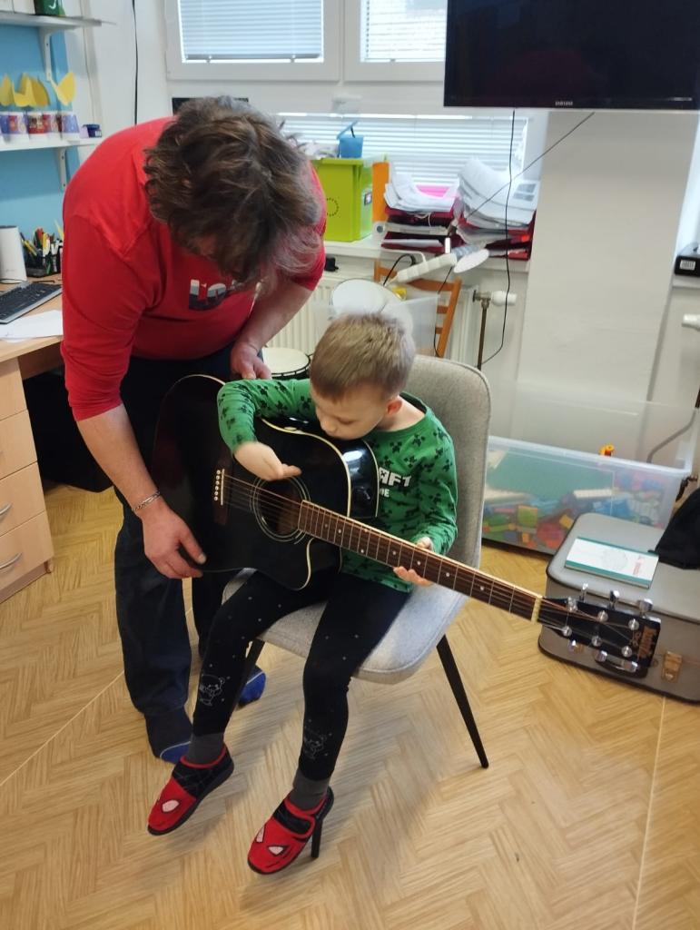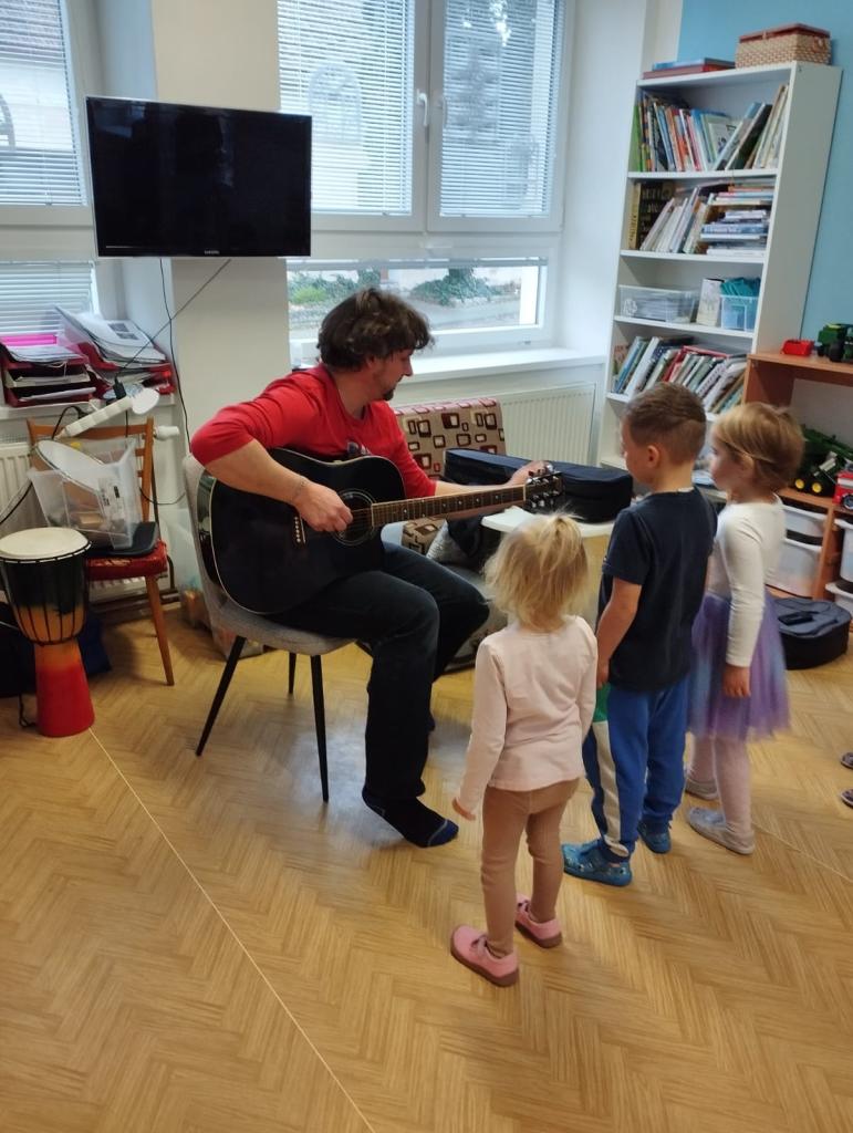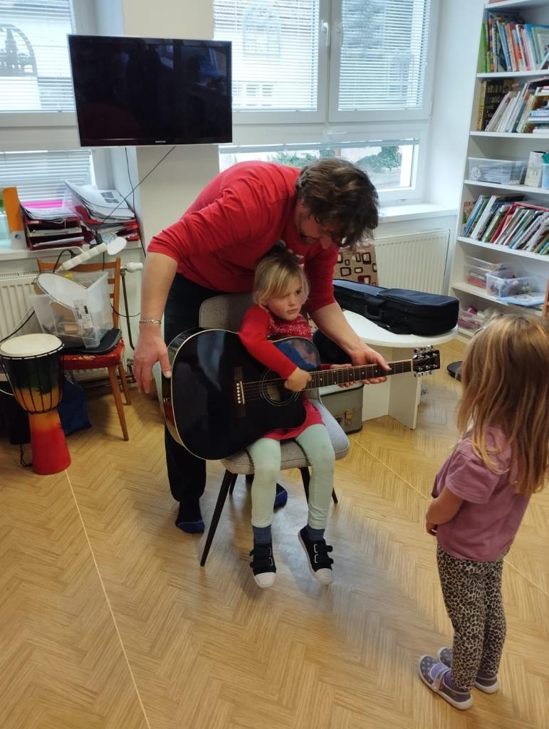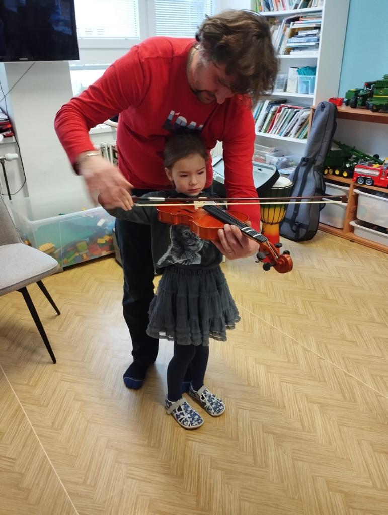 Další příjemnou návštěvou byl tatínek pan Dvořák, který dětem představil svět hudby. Společně si povídali o hudebních nástrojích, zpívali, zahrál jim na harmoniku, kytaru, housle a další hudební nástroje.. Děti si je navíc mohly samy vyzkoušet, což pro ně byl velký zážitek.