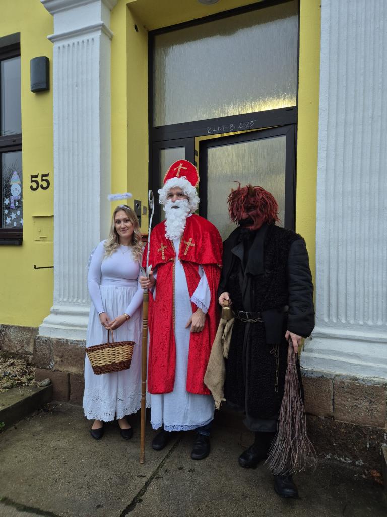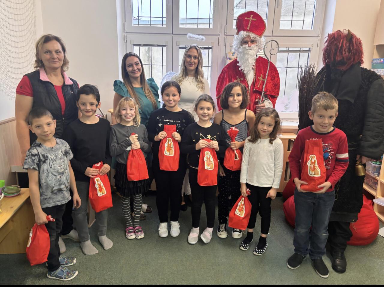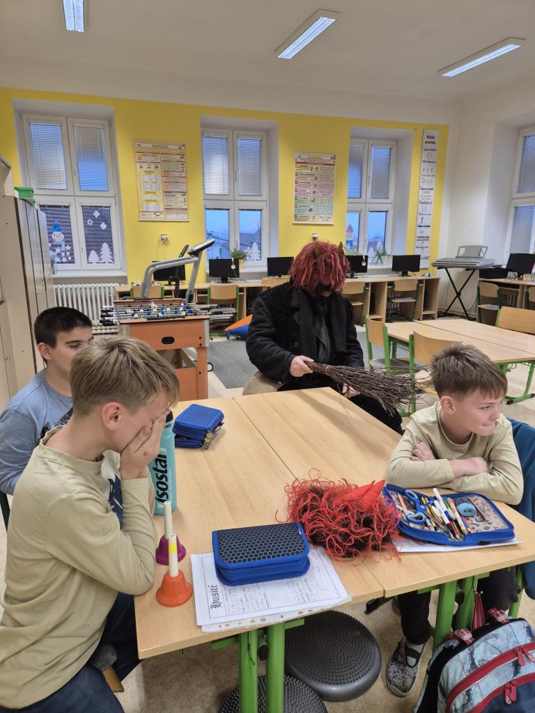 V pátek 5. 12. 2025 dorazili do naší školy nebešti posli - svatý Mikuláš a anděl. Přišel s nimi samozřejmě i vyslanec pekla - čert. Mikuláš věděl o každém žákovi, jak se chová, zda doma pomáhí, ale i to, v čem by se měl zlepšit. Anděl každému nadělil balíček s dobrotami a čert k tomu některým rozdával brambory. K překvapení všech nám zůstali všichni žáci, nikoho si čert neodnesl :-) Hezká písnička nebo básnička, kterou děti nacvičily, všechny velmi potěšila.