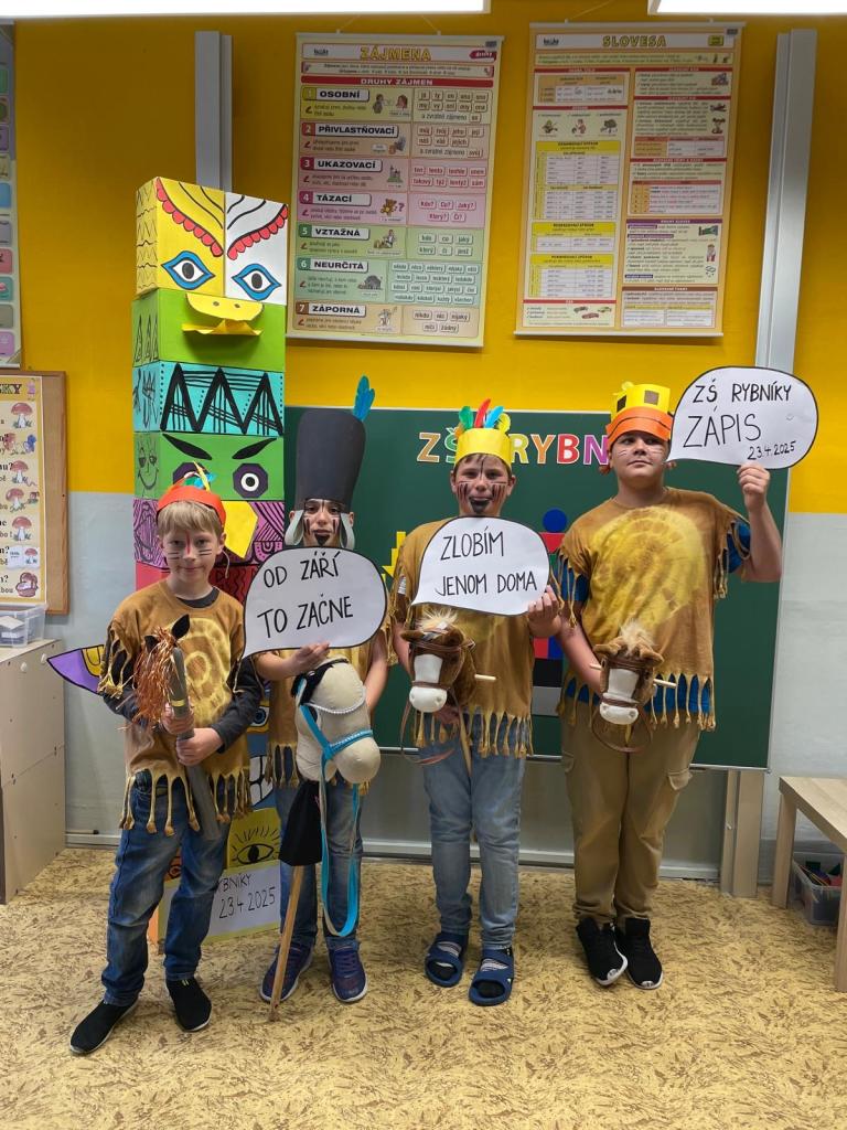 Zápis do 1. třídy ZŠ Rybníky se uskutečnil ve středu 23.4. od 16 hod. Předškoláky přivítali indiáni (žáci 5. třídy) písní: „Indiáni jedou, copak asi vezou ………“ Za zvuku afrických bubnů se rozjeli po třídě na svých koních a vytvořili tak tematickou atmosféru.