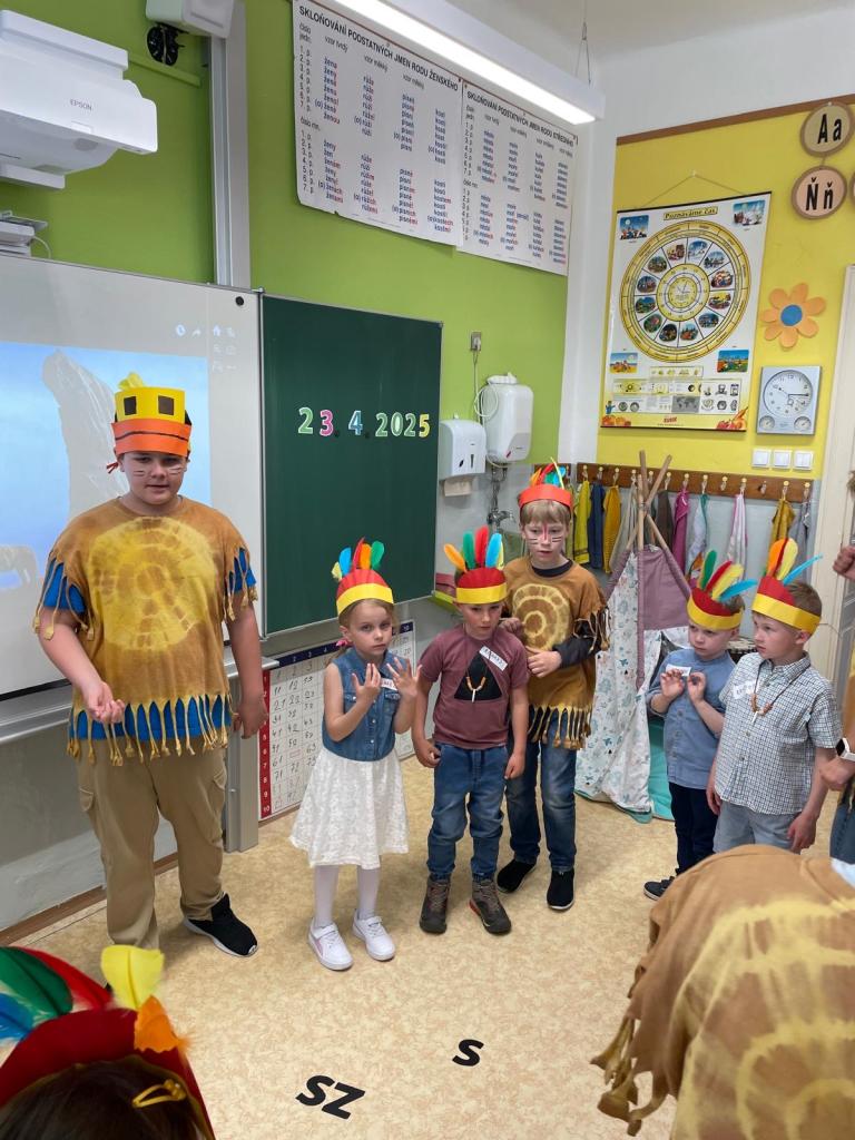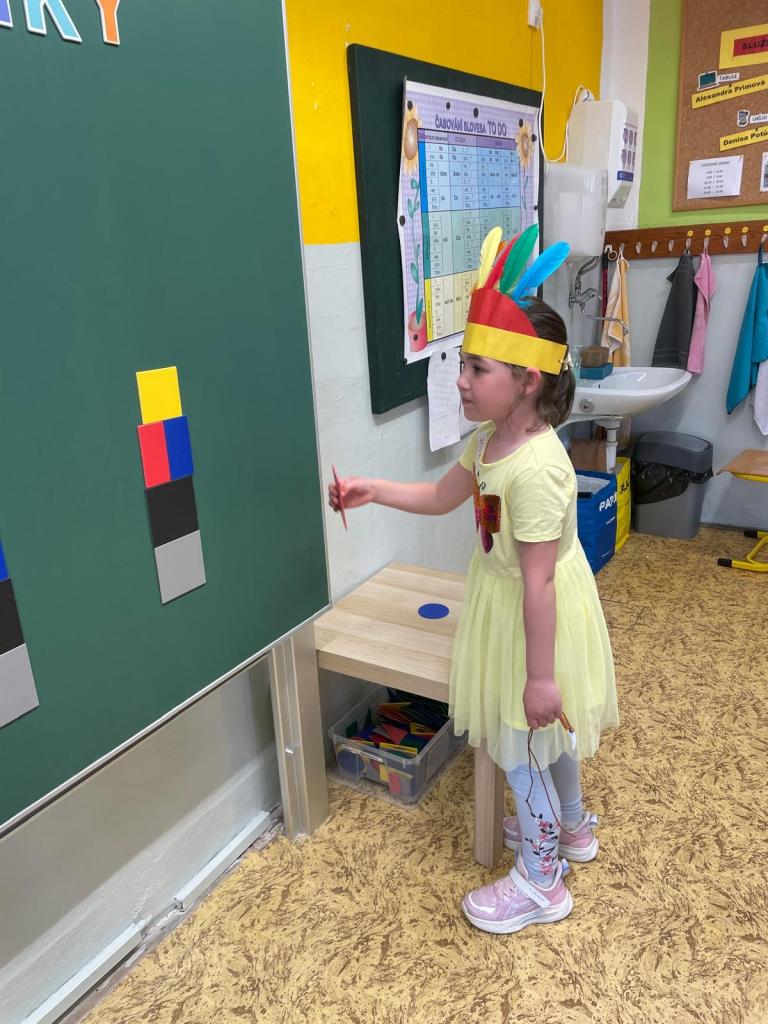 Ve třídách děti pracovaly s interaktivní tabulí, pojmenovávaly barvy a tvary, určovaly počet prvků, vytleskávaly slova, určovaly slabiky, skládaly puzzle, v tělocvičně si proběhly indiánskou stezku a zastřílely si z luku na jelena. Na závěr si zatančily indiánský tanec a vyfotily se ve fotokoutku.